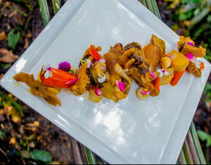 ETAPE 2 Découpez votre poulet à cru et récupérez la crête du coq et le gésier bien les nettoyer épluchez les tubercules, les rincer mettez l’huile de palme à chauffer dans une cocotte